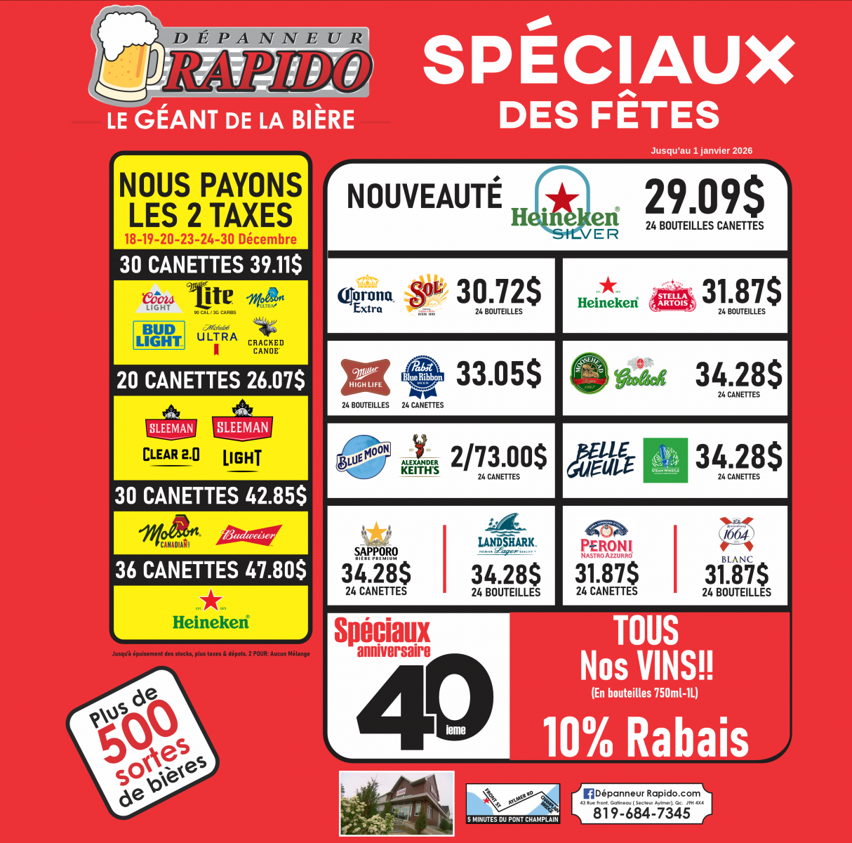 Depuis plus de 40 ans, le dépanneur Rapido est l’endroit incontournable pour l’achat de bière en Outaouais. Le «géant de la bière» offre, à ce jour, plus de 500 produits de bières variés au meilleur prix sur le marché. Vous-y trouverez des bières de microbrasseries québécoises, de brasseries populaires et des bières importées. Découvrez nos sélections de bière en magasin ou en ligne !